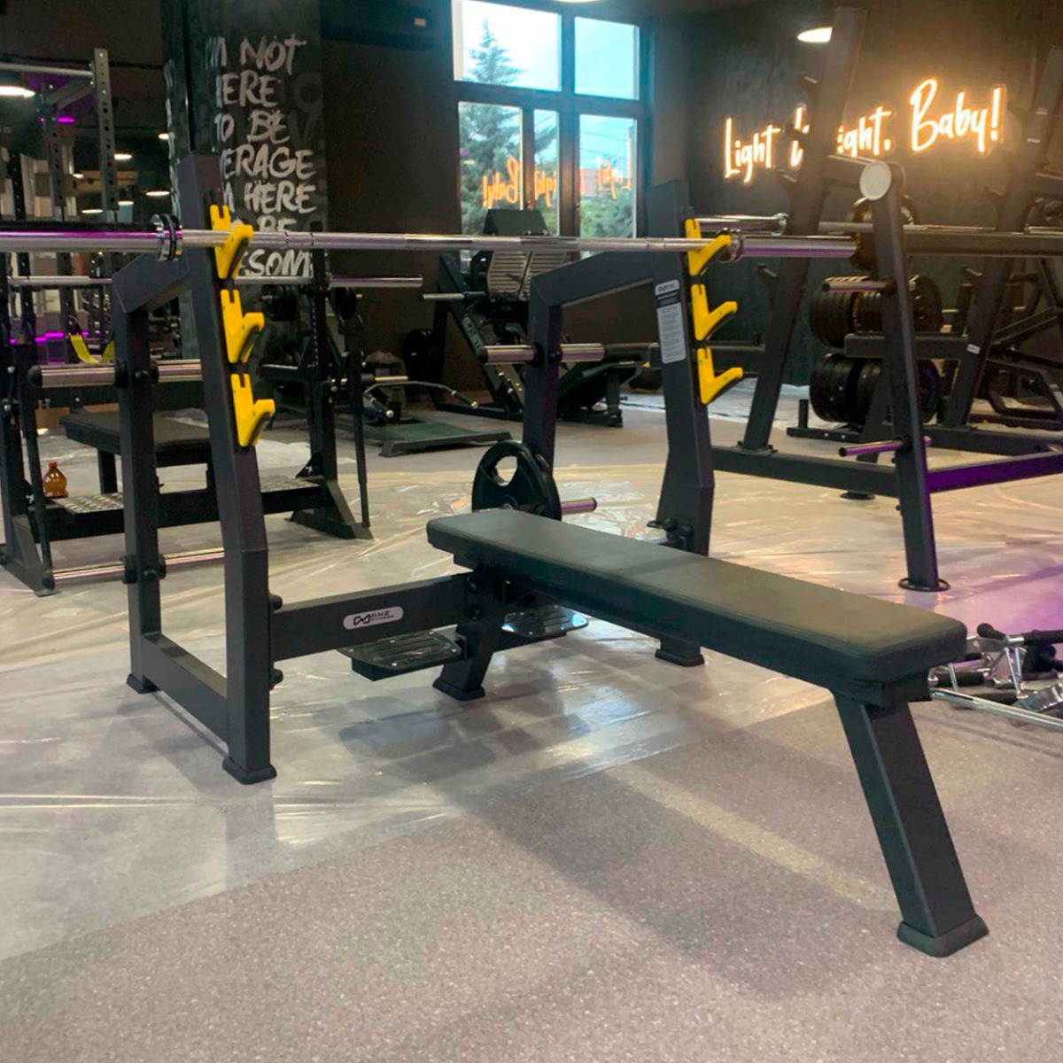 Держатели для штанги расположены на трёх уровнях и выполнены из ударопрочного пластика, предотвращающего повреждения покрытия рамы.