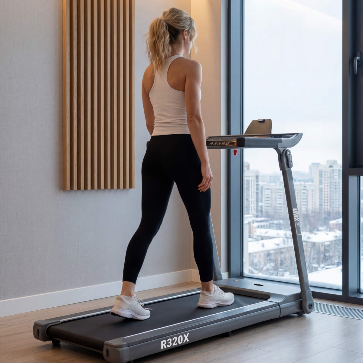 Уникальная система складывания превращает UNIX Fit R-320X в компактную беговую дорожку, которую легко убрать под диван или поставить к стене - толщина рамы всего 14 см. Это особенно важно для тех, кто ценит пространство и ищет спортивный тренажер, не занимающий много места. Сенсорная консоль с LED-подсветкой отображает все ключевые параметры: время, скорость, дистанцию, калории и пульс, который измеряется с помощью сенсорных датчиков на поручнях. Для удобства предусмотрена подставка под планшет, а мультимедийная система с двумя мощными динамиками и поддержкой USB и AUX позволяет наслаждаться любимой музыкой во время занятий.