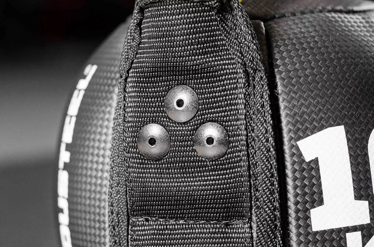 Ядро и крепление ручки прошиты прочными нейлоновыми нитями. Дополнительно есть 3 металлические заклепки с каждой стороны. Получается жесткое надежное крепление.