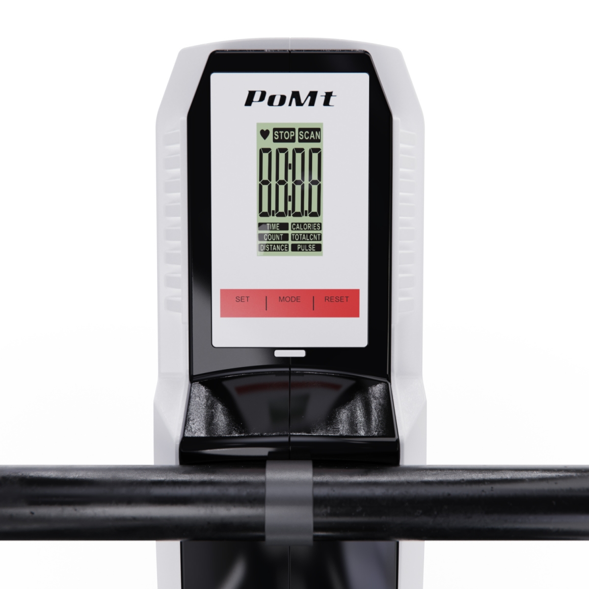 Монохромный LCD-дисплей отображает основные параметры тренировки, такие как пульс, время, количество гребков, общее количество гребков и калории, а также имеет режим сканирования. Размер консоли 15 х 9,5 х 3 см. Для работы консоли в комплект входят две батарейки типа АА.