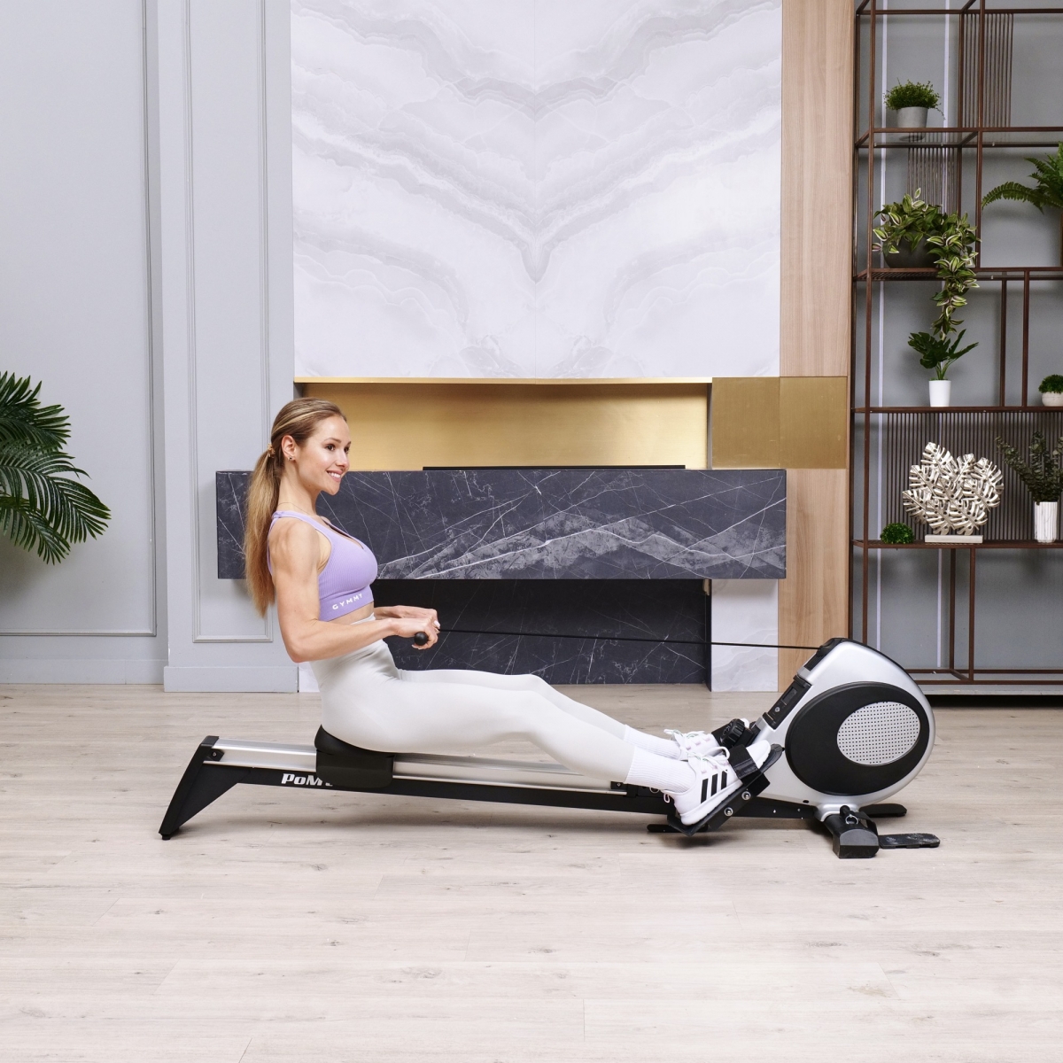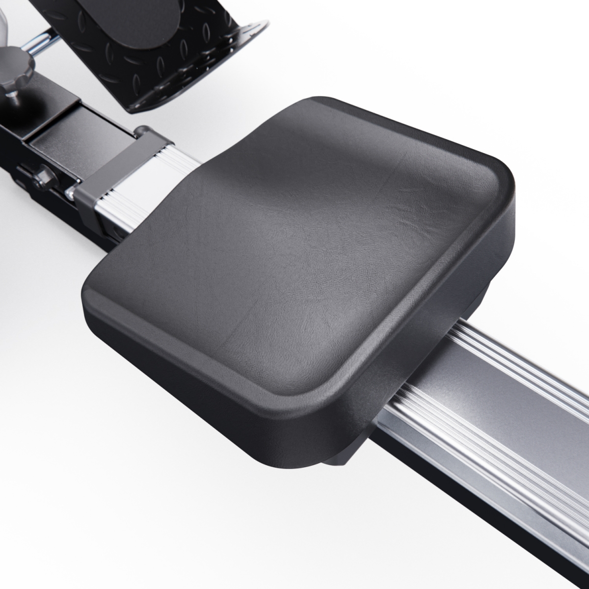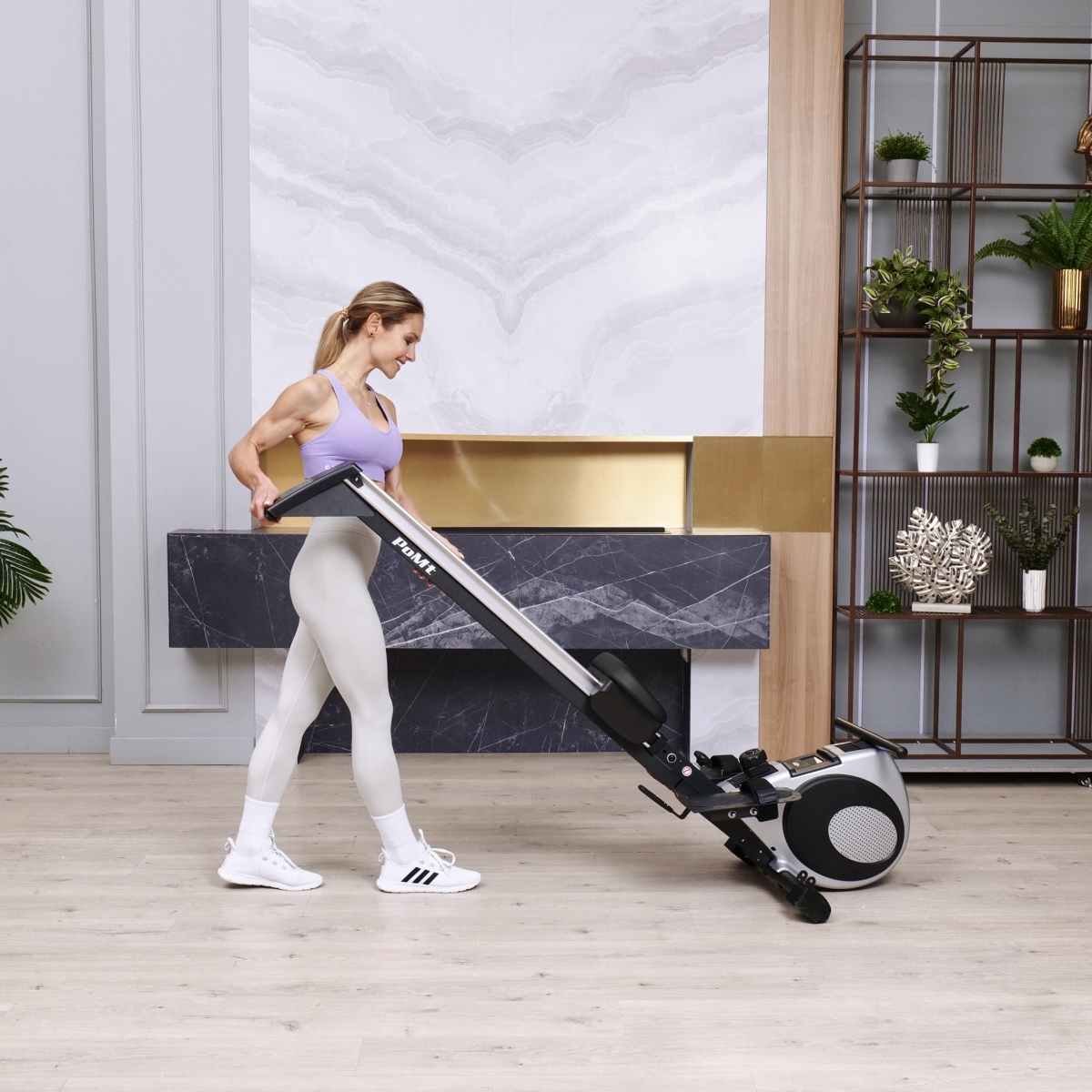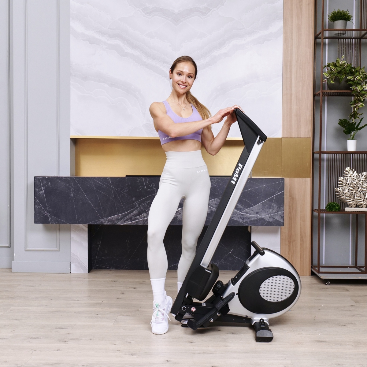 В рабочем состоянии гребной тренажер кардио имеет размеры 190 x 58 x 50 см, а также имеет компактные размеры в сложенном виде (123 x 58 x 124 см) и транспортировочные ролики, что позволяет удобно его хранить и легко перемещать его по дому.