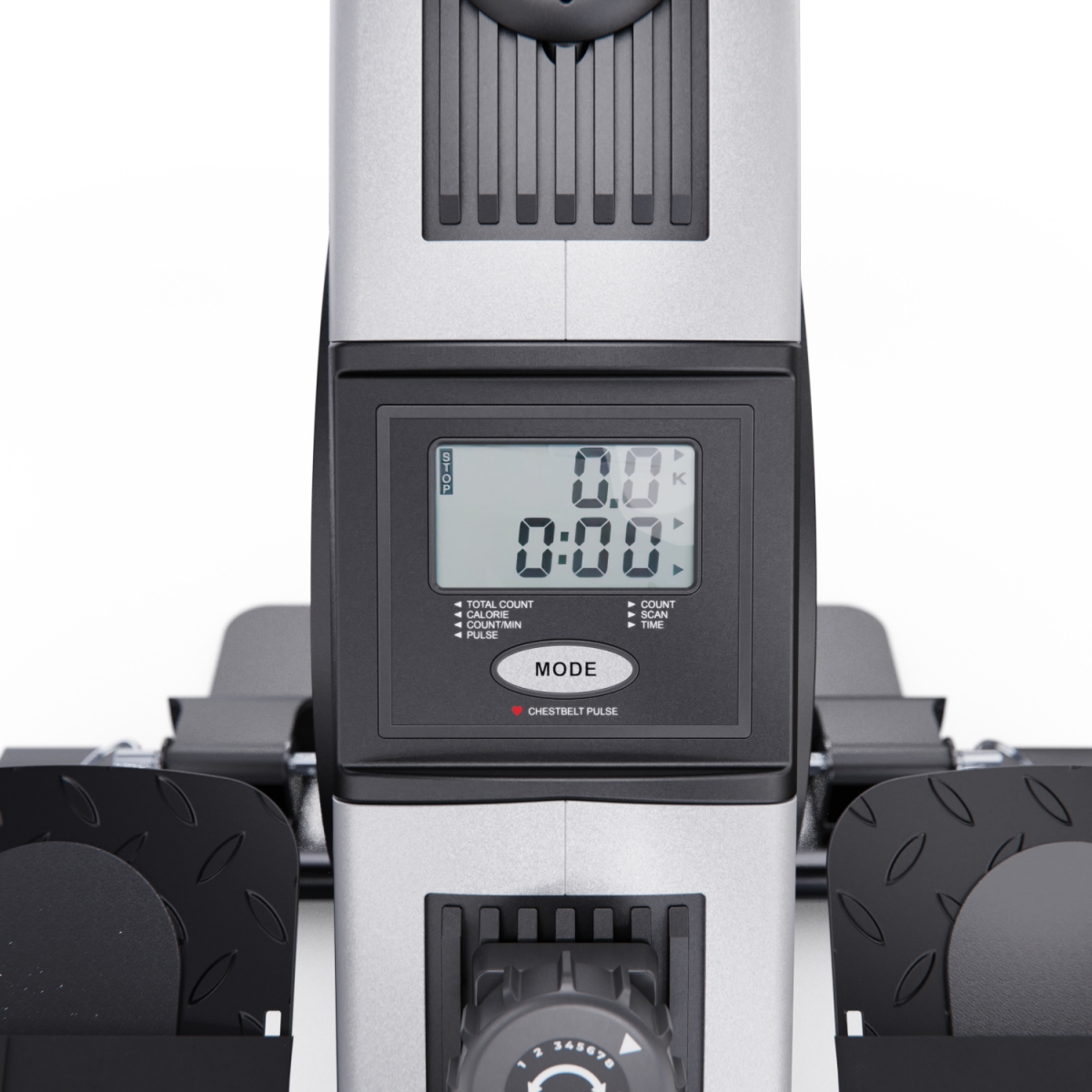 Монохромный LCD-дисплей отображает основные параметры тренировки, такие как время, количество гребков, общее количество гребков и калории, а также имеет режим сканирования. Размер консоли 10,5 х 11 х 3 см.