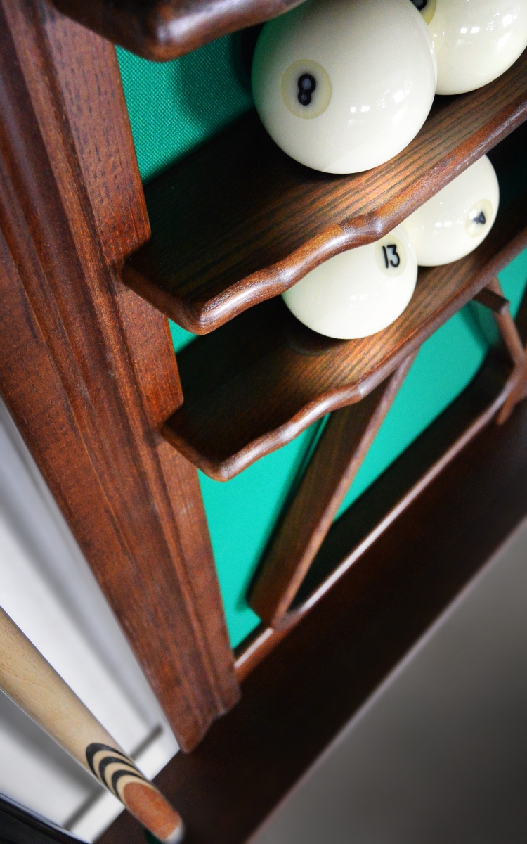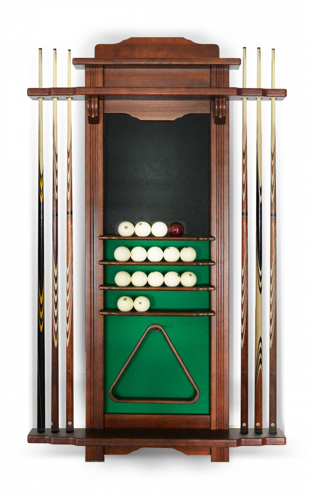 Модель настенная, предназначена для 6 киев, позволяет разместить треугольник, мелки, а также бильярдные шары. Материал сосна. Есть возможность выбрать цвет из палитры Фабрики «Старт»
