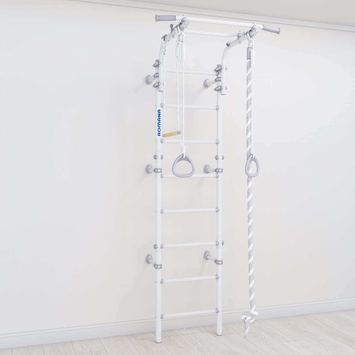 Детский спортивный комплекс ROMANA Next Muar представляет собой элегантное обновление самой востребованной модели в ассортименте шведских стенок, покрытый бархатистым покрытием Муар. Комплекс имеет белые матовые стойки, гладкие металические перекладины и серую фурнитуру, которая сочетается с навесным оборудованием хорошо впишется в современный интерьер.