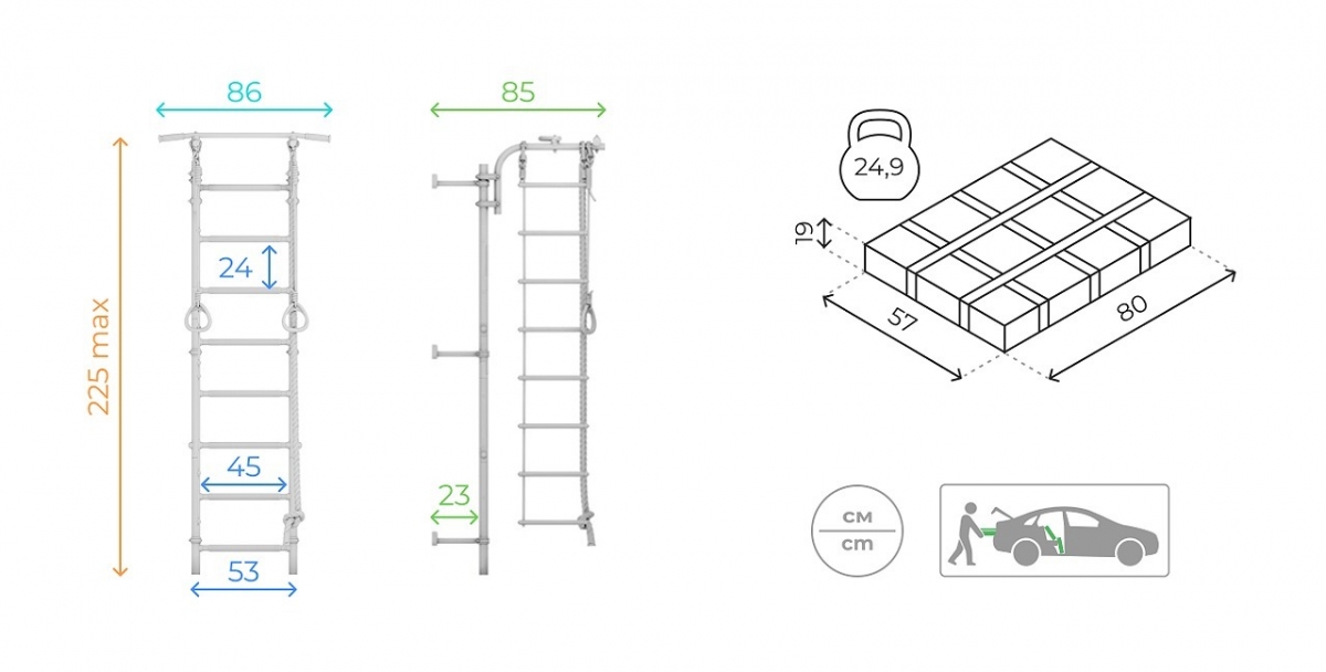 В комплект входят массажные ступени для развития моторики и профилактики плоскостопия, а также навесное оборудование в той же цветовой гамме: кольца, веревочная лестница и канат. Комплекс упакован компактно, что позволяет перевозить его в легковом автомобиле. Размеры упаковки составляют 57х80х19 см.