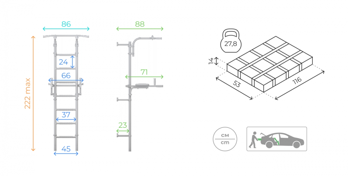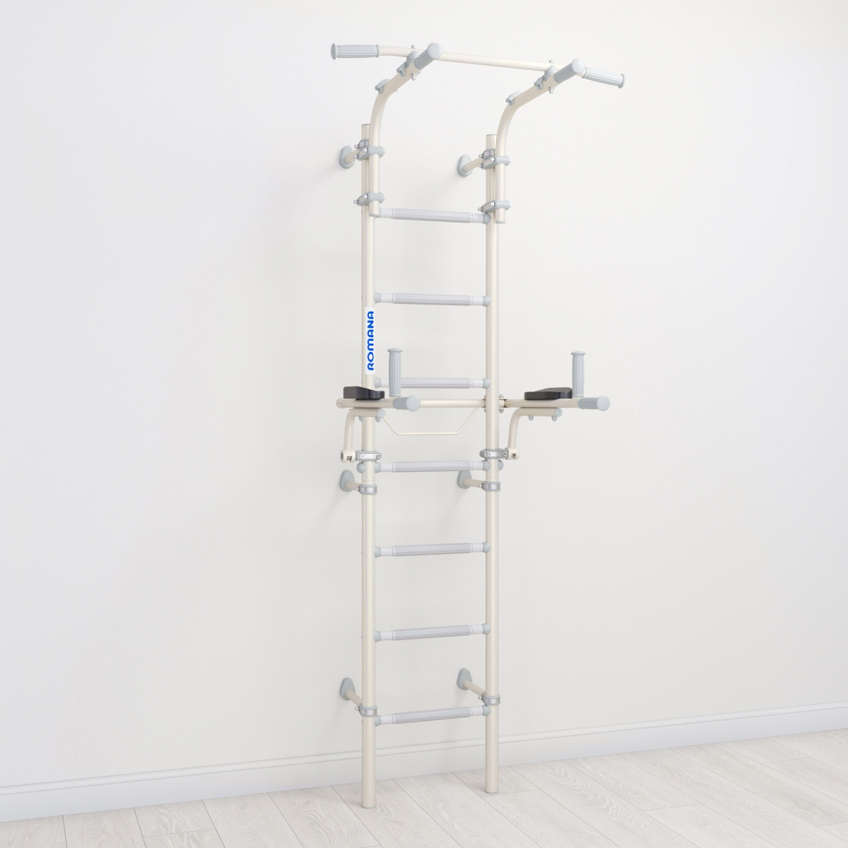 ROMANA S10 Pastel - домашний спортивный комплекс для всей семьи, на нем могут заниматься и дети, и взрослые. Он достаточно компактен и не занимает много места: ширина ступеней составляет 410 мм, это самый оптимальный размер для занятий на брусьях, которые идут в комплекте. Брусья откидные, и после занятий их можно перевести в вертикальное положение. Турник можно передвигать по высоте, и закрепить как удобно пользователю с помощью надежных современных хомутов. Спортивный комплекс фиксируется к стене, фиксаторы можно передвигать по вертикали, чтобы избежать попадания в проводку или полости.