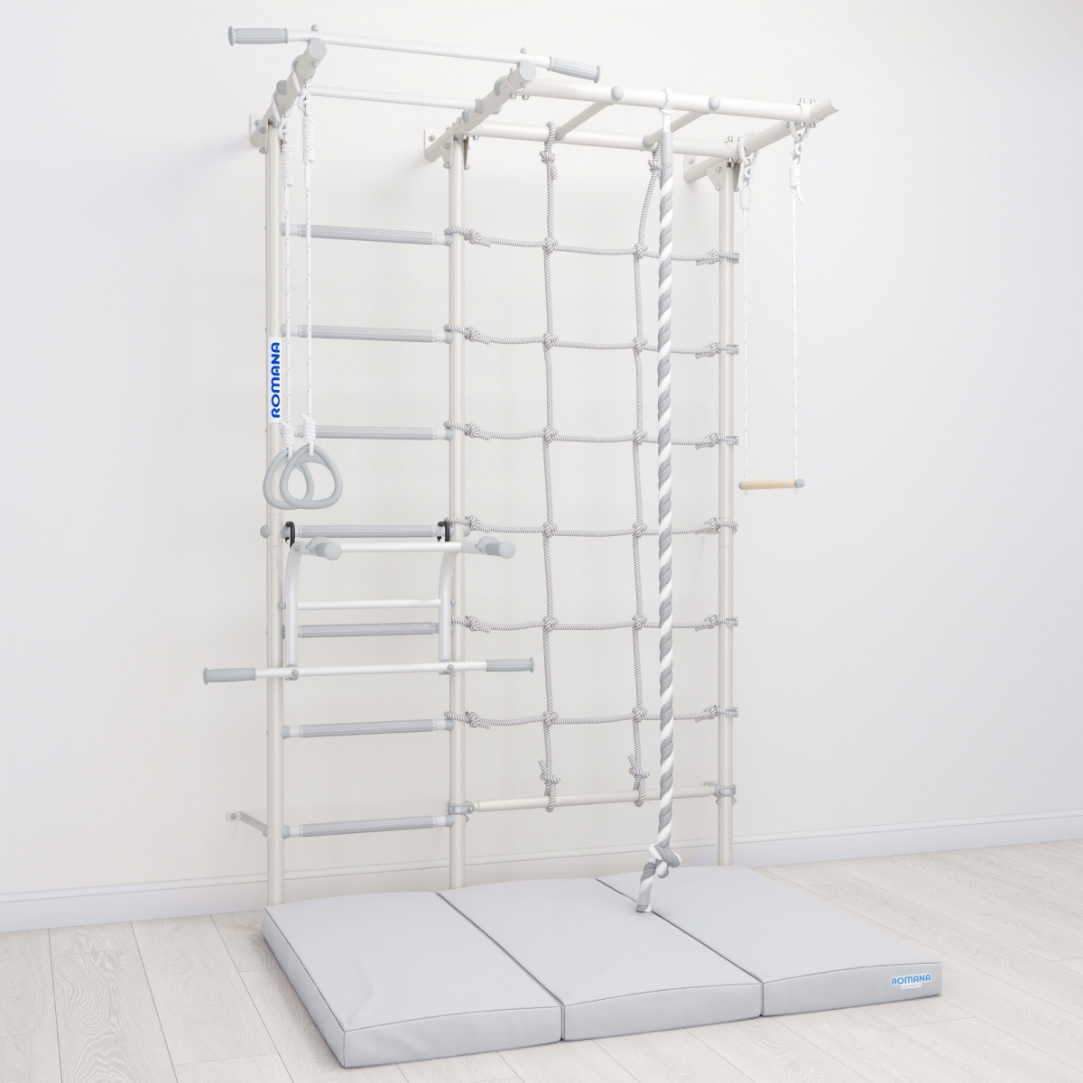 Компактный пристенный комплекс позволит создать спортивное пространство даже в небольшом помещении. Развивающий тренажер создает оптимальные условия для комфортных домашних тренировок всей семьи. Ступени шведской стенки оснащены массажным покрытием. Во время занятий, ступени стимулируют кровоток, препятствуют развитию плоскостопия,оказывают мягкий массажный эффект ступней и ладоней.