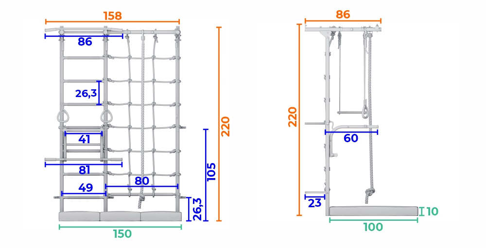 Множество элементов разнообразят активный досуг, тем самым способствуя интенсивному физическому развитию организма. Дополняет комплекс мат толщиной 100мм, который обеспечивает комфортные и безопасные занятия на игровых объектах. Упругий мат в три сложения компактен, его легко хранить и транспортировать.