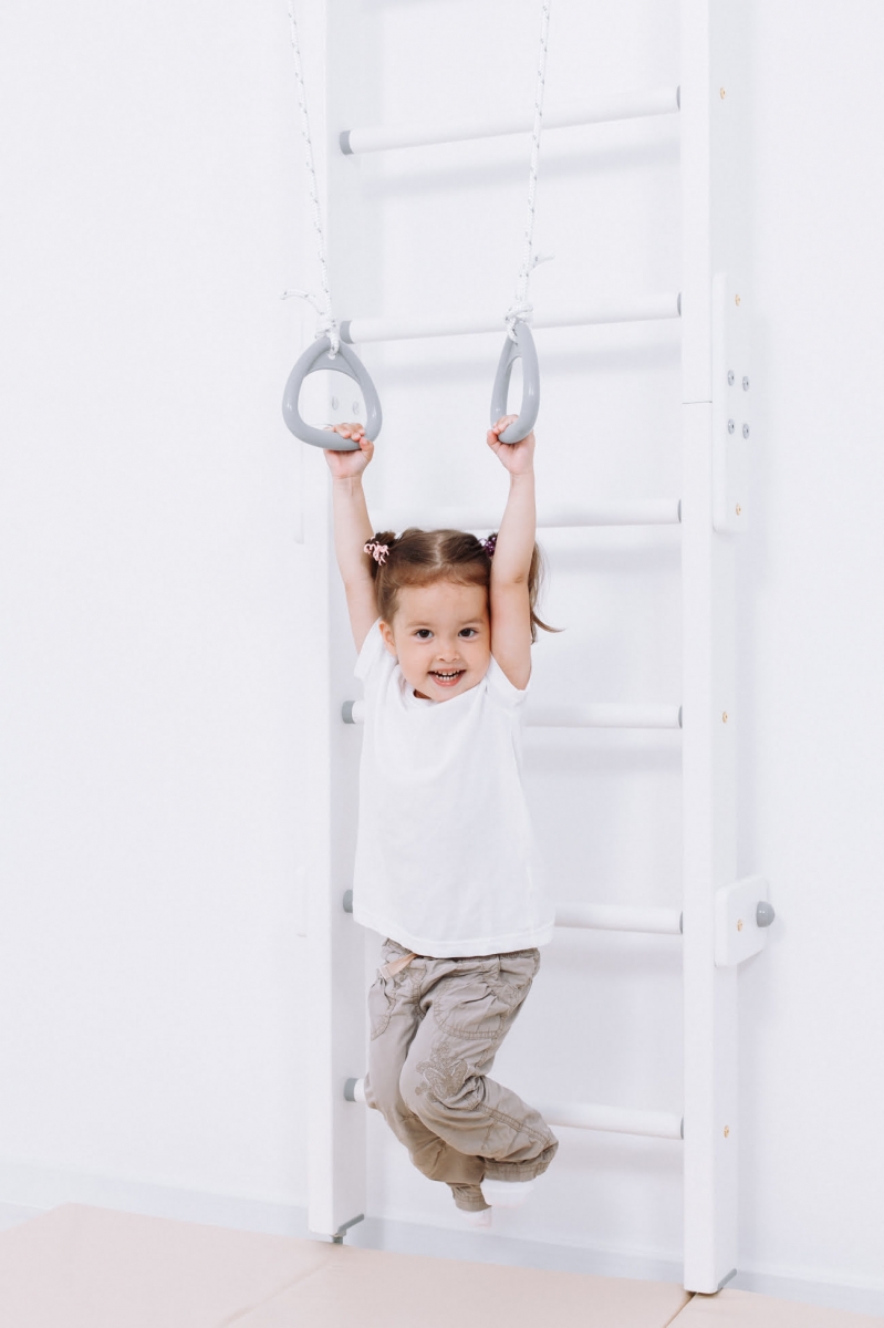Это современное исполнение деревянной шведской стенки. Несущие конструкции данной модели изготовлены из хвойных пород дерева. Покрытие комплекса выполнено краской белого цвета, экологически безопасной для детей.
