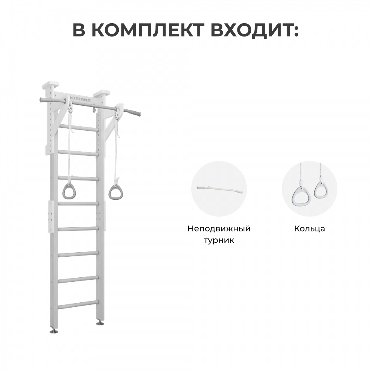 Спортивный комплекс ROMANA Eco1.1 устанавливается как враспор, так и к стене — пользователь сам выбирает удобный вариант монтажа. Таким образом, стенку можно установить практически в любом месте дома. В комплексе Eco1.1 предусмотрен фиксированный турник, а также кольца, которые можно разместить на нем.