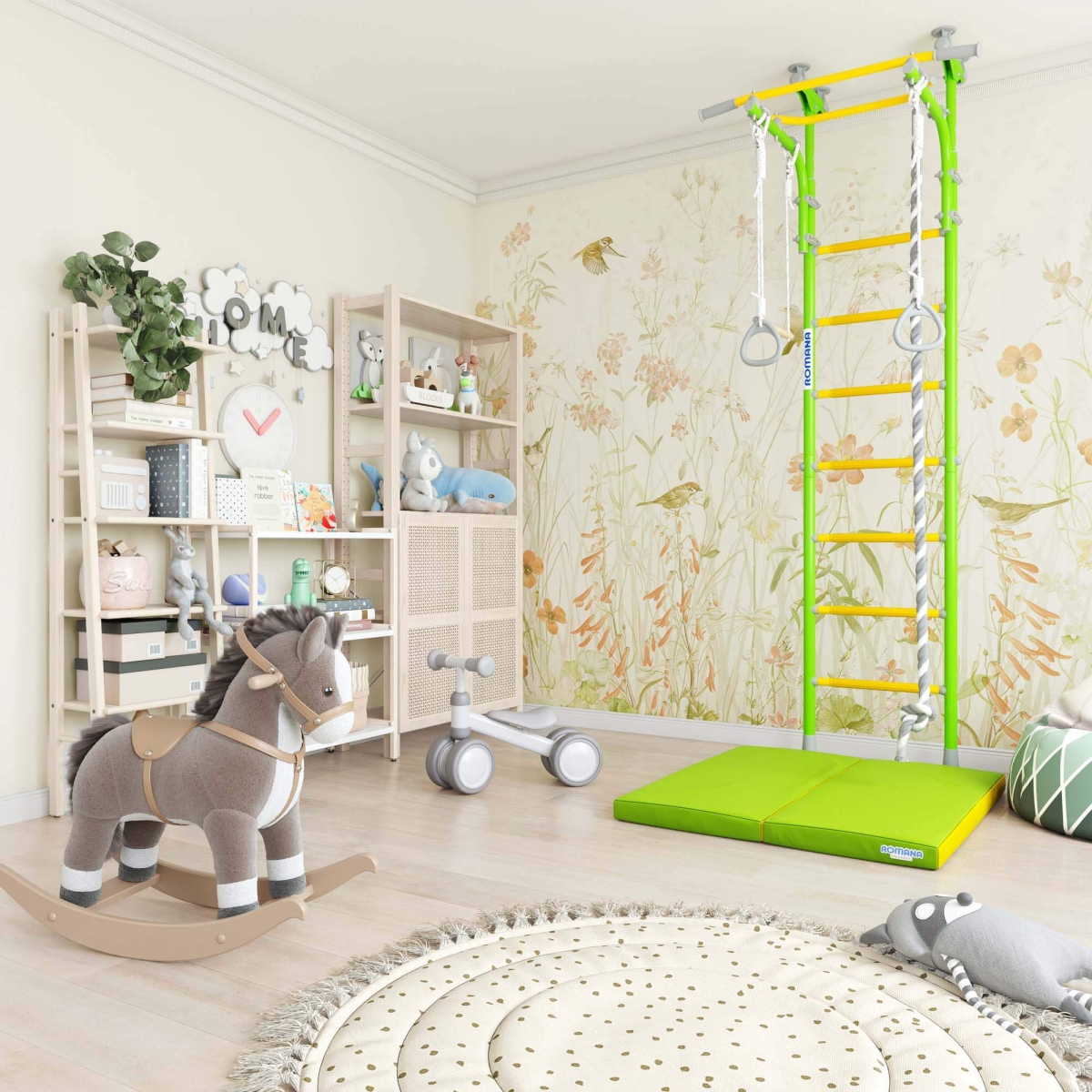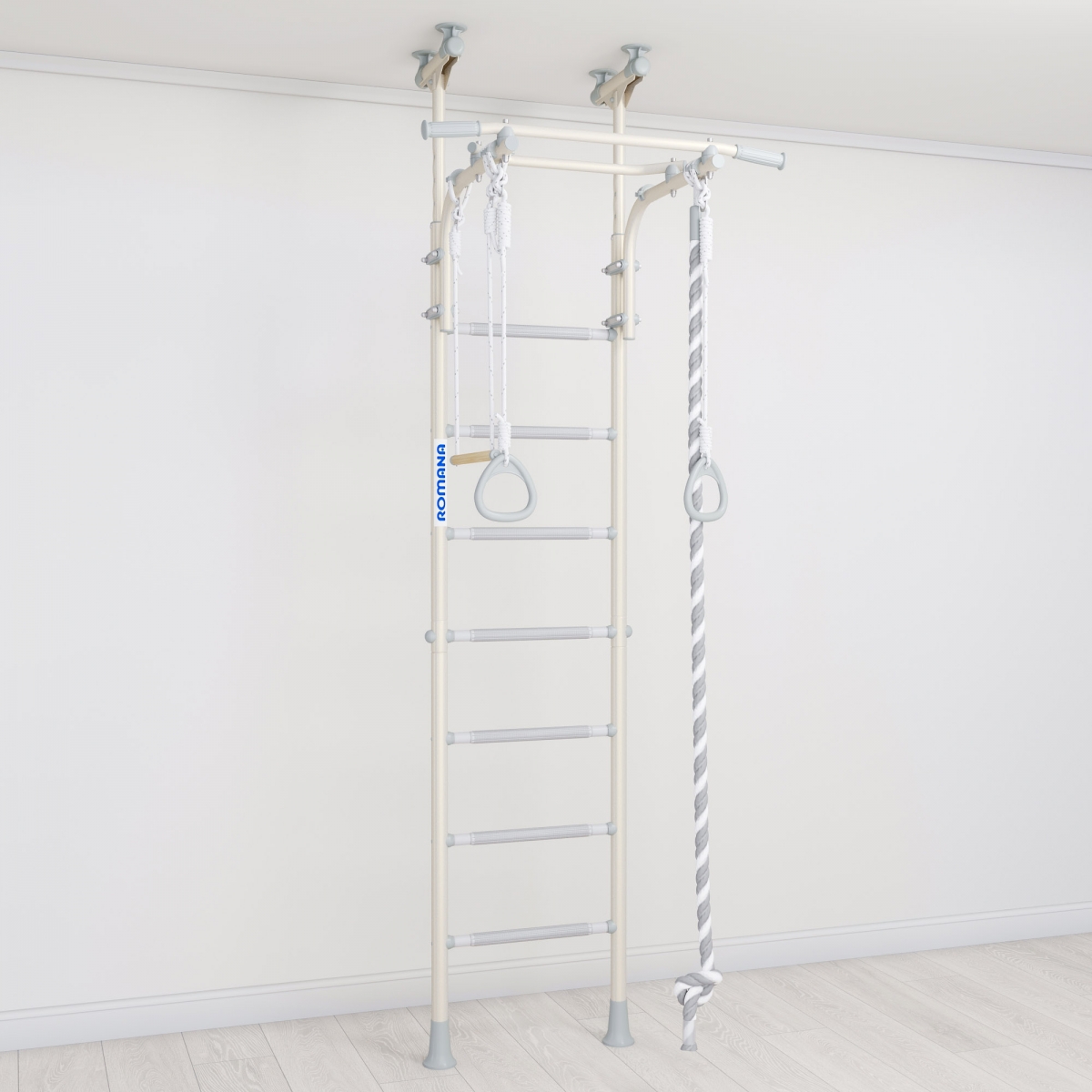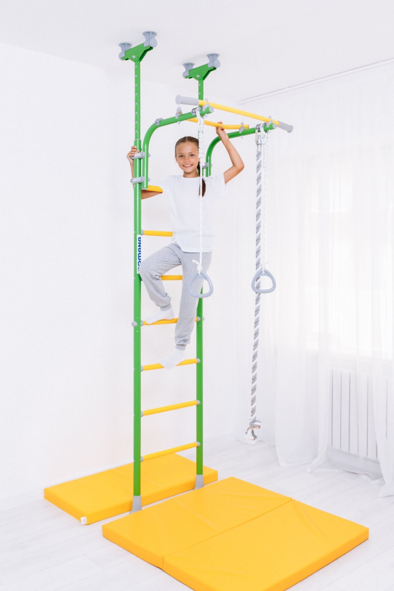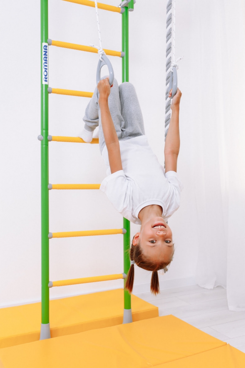 Детский спортивный комплекс ROMANA R5 Kometa - современная шведская стенка с возможностью установки враспор к полу и потолку. Не нужно сверлить стену и крепить к ней раму. Металлокаркас стенки рассчитан на вес в 100 кг (испытан нагрузкой в 200 кг).