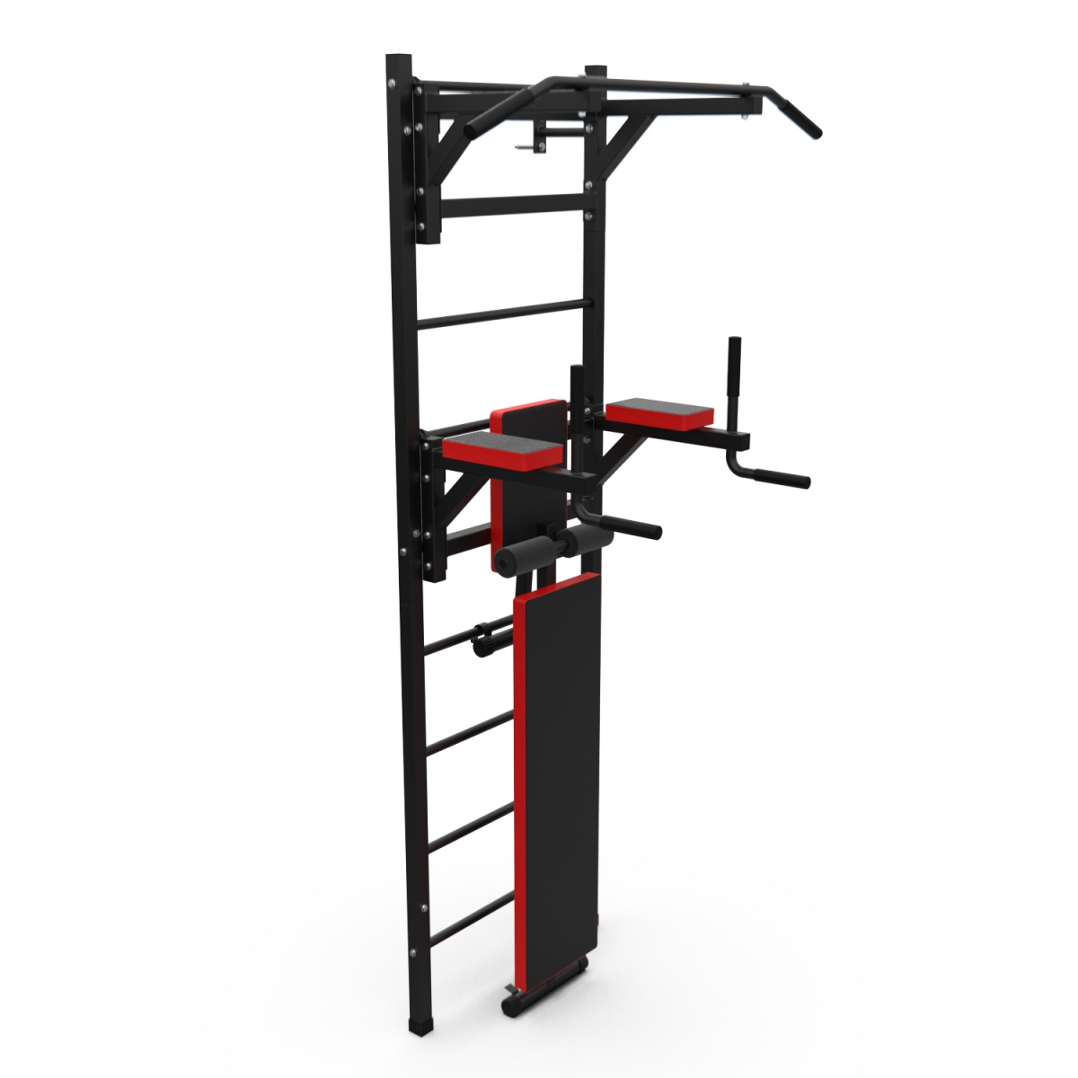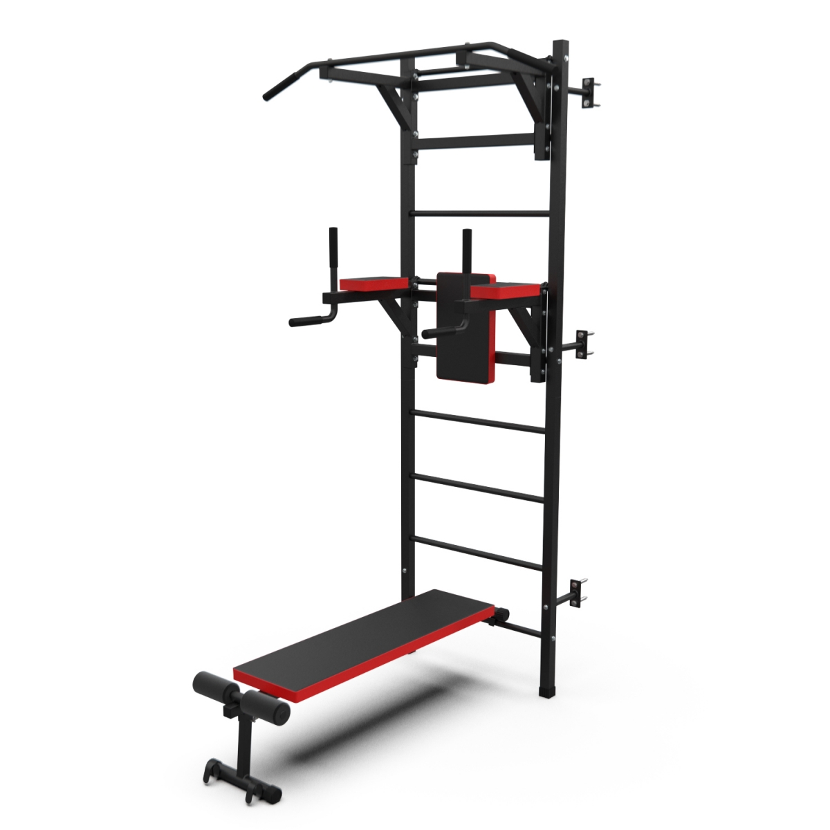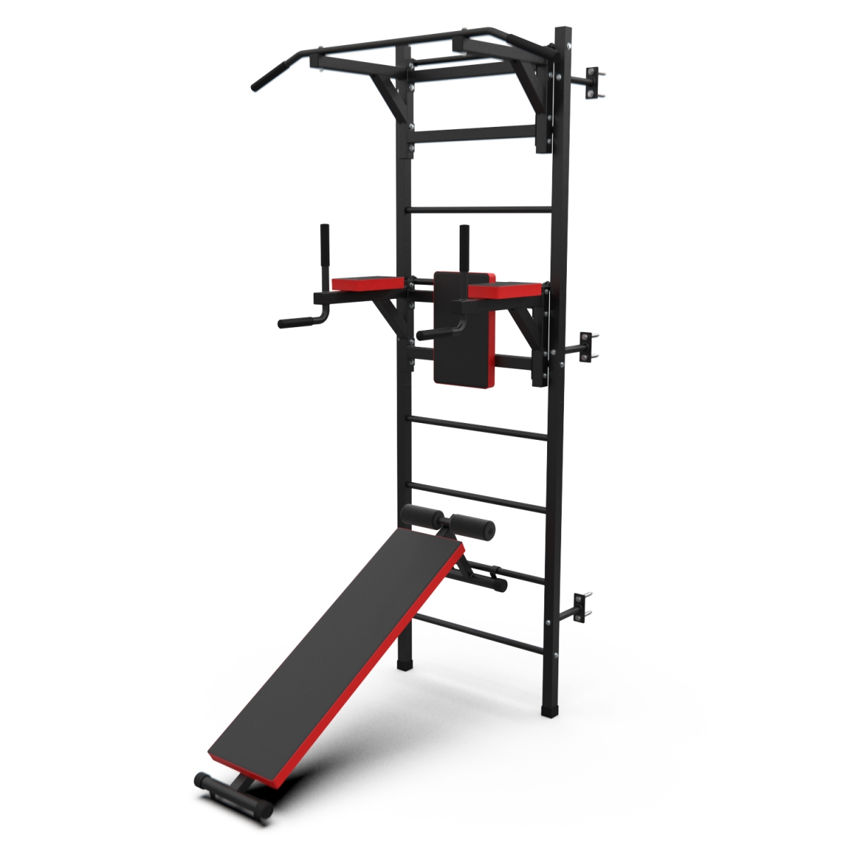Турник длиной 99 см оснащён мягкими неопреновыми ручками, очень легко перевешивается на перекладины шведской стенки, что позволяет менять его высоту. Расстояние от ручек турника до шведской стенки (вынос турника) - 72 см. Вынос брусьев – 87 см, размер подушки под спину 42 х 25 см, а её толщина 5 см. Подушки подлокотников размерами 25 х 13 х 5 см, а поручни длиной 32 см диаметром 25 мм и толщиной стали 1,5 мм.