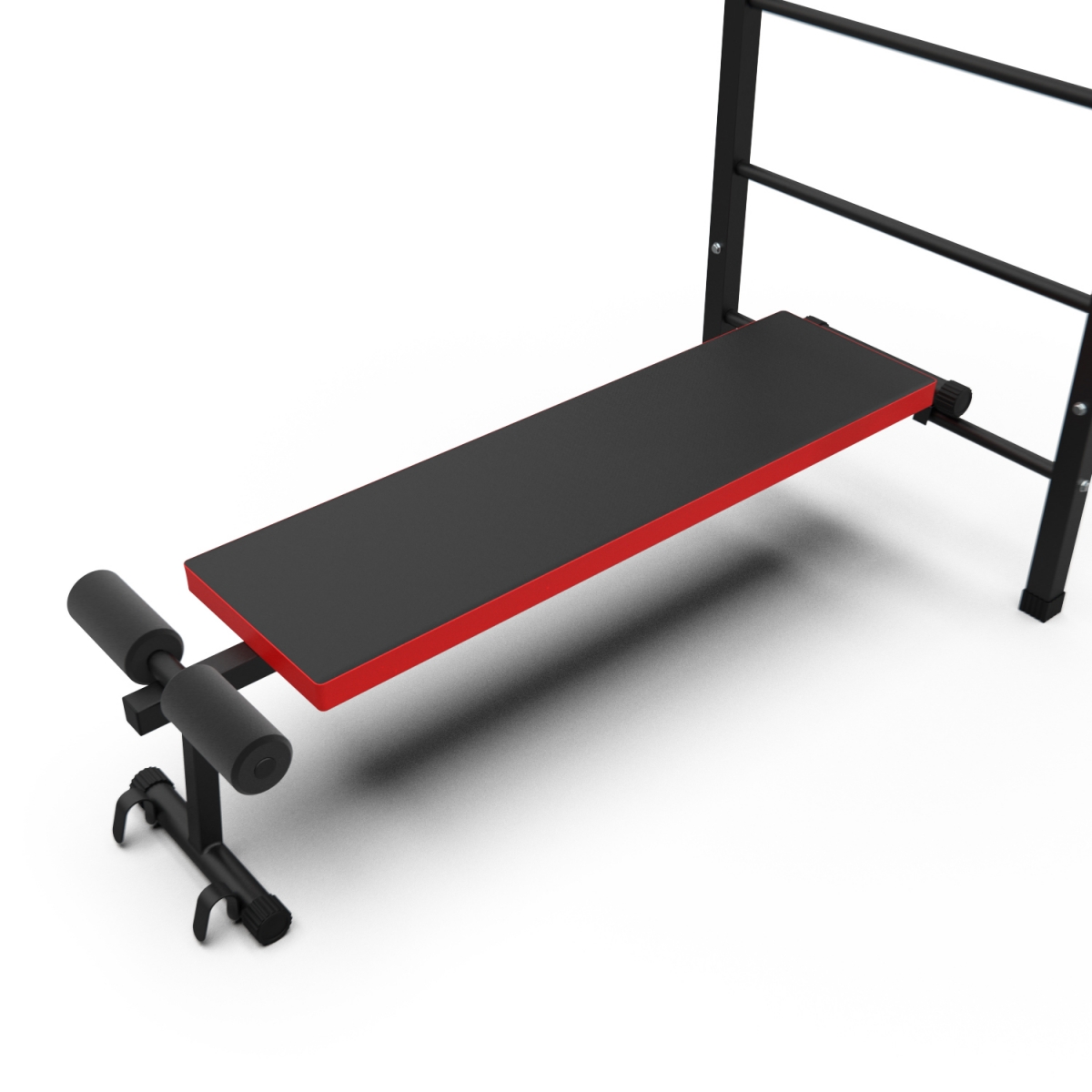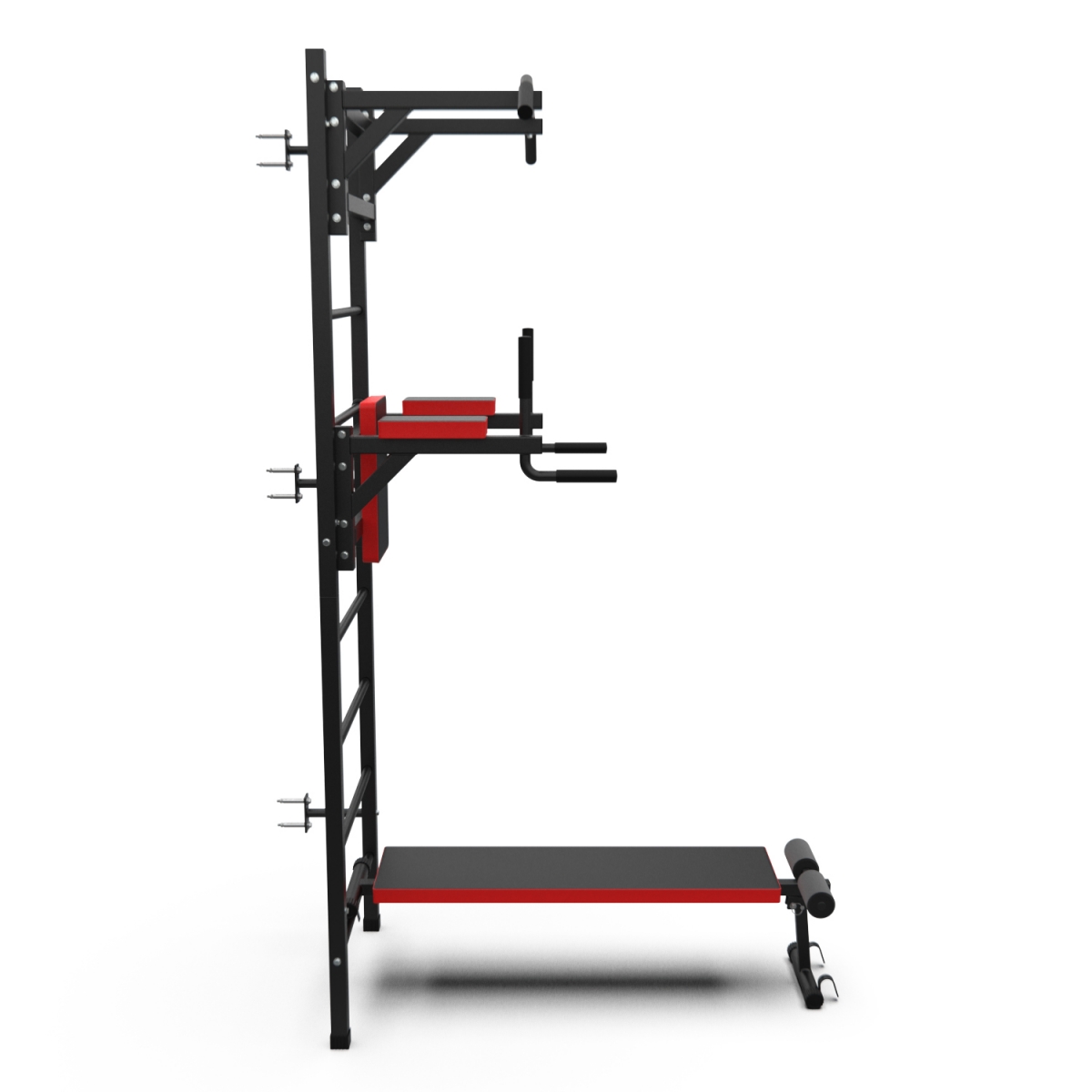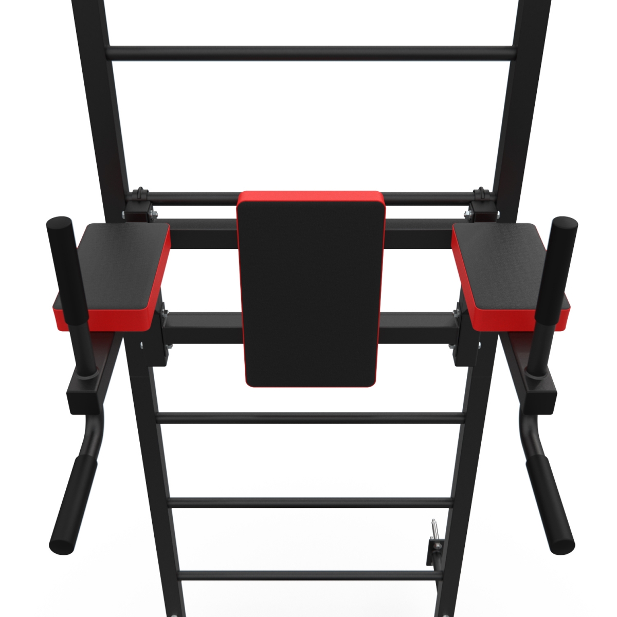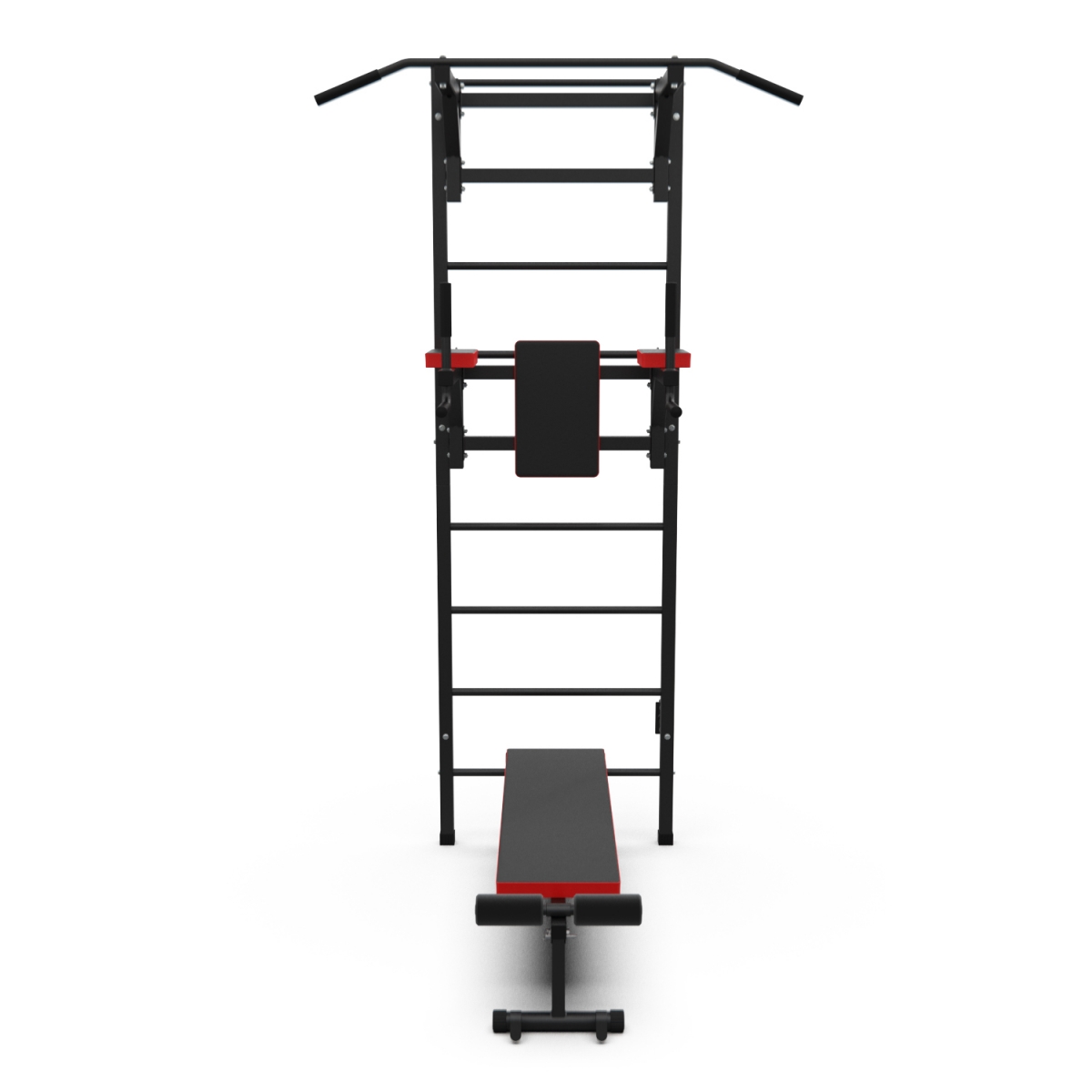 Турник длиной 99 см оснащён мягкими неопреновыми ручками, очень легко перевешивается на перекладины шведской стенки, что позволяет менять его высоту. Расстояние от ручек турника до шведской стенки (вынос турника) - 72 см. Вынос брусьев – 87 см, размер подушки под спину 42 х 25 см, а её толщина 5 см. Подушки подлокотников размерами 25 х 13 х 5 см, а поручни длиной 32 см диаметром 25 мм и толщиной стали 1,5 мм.