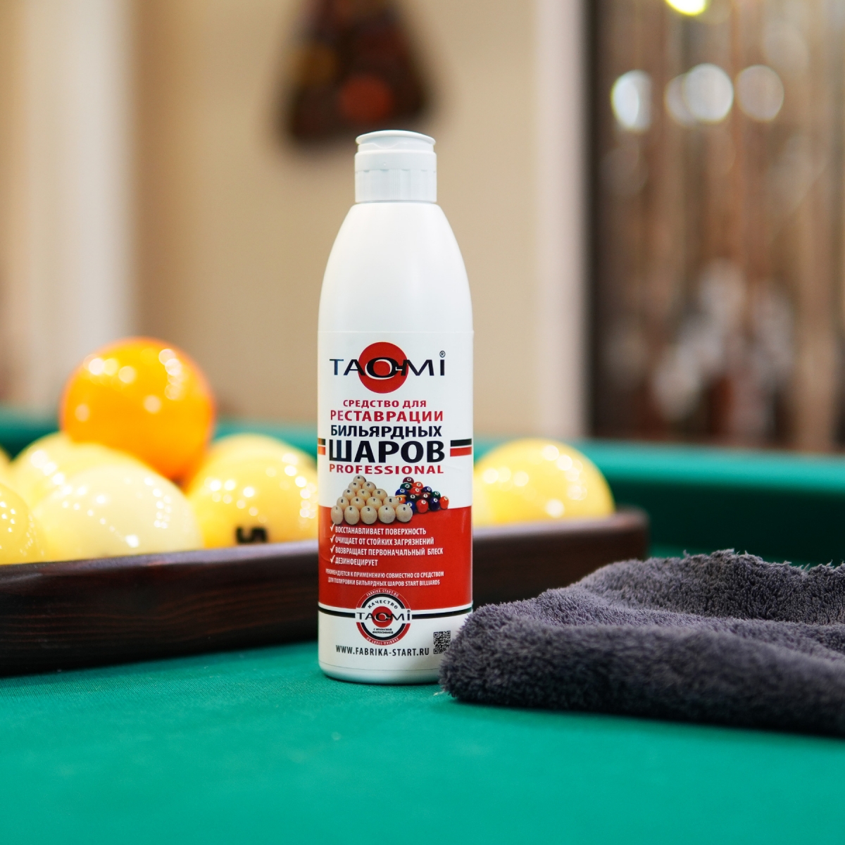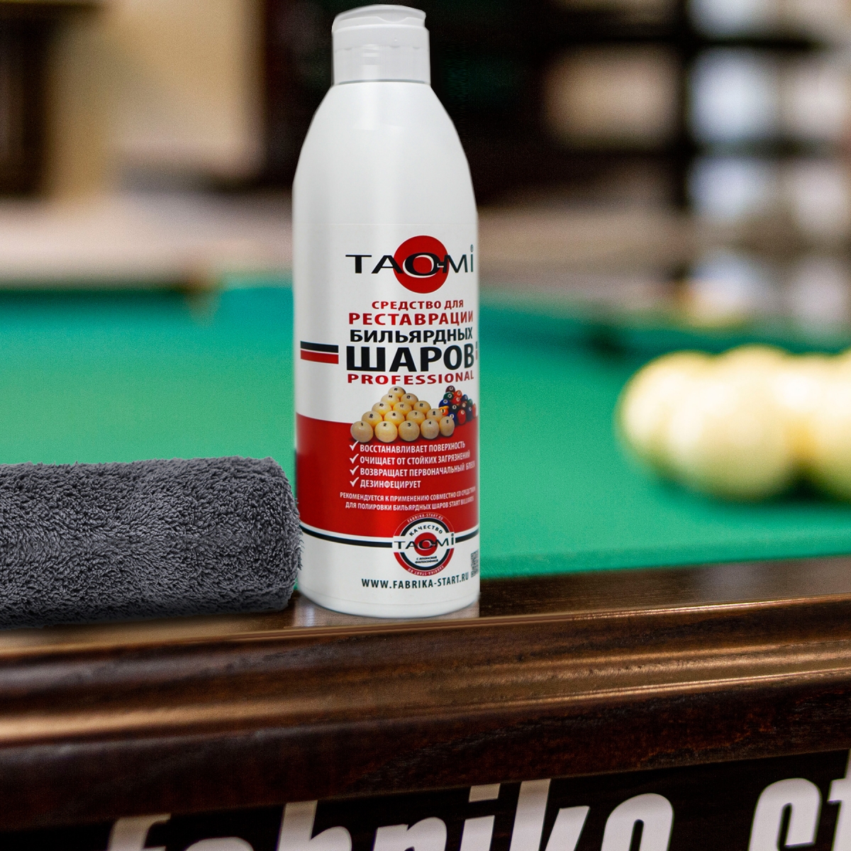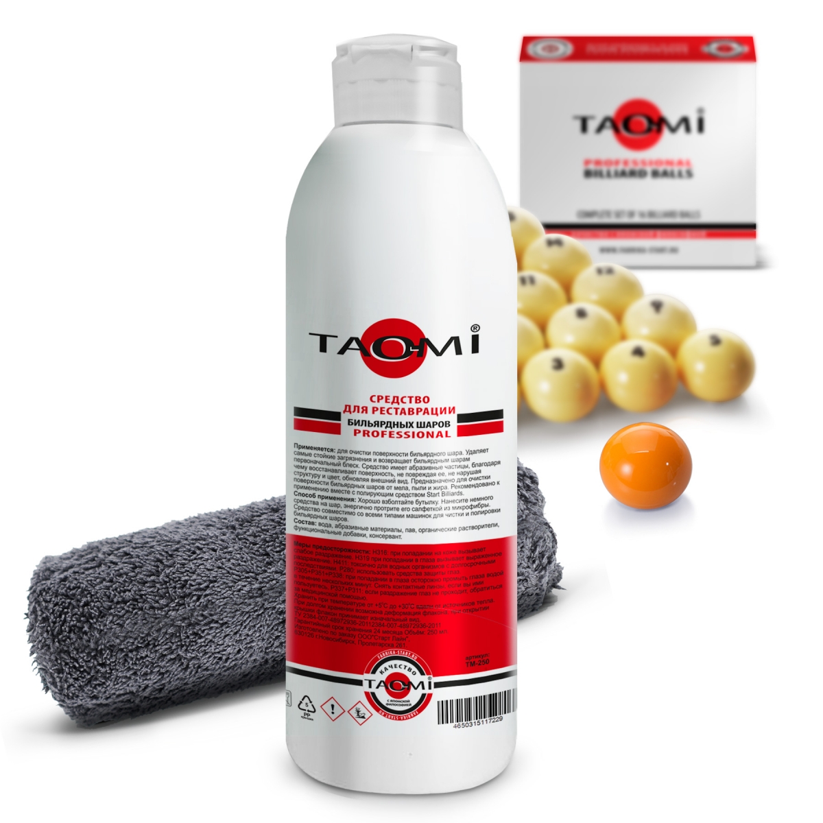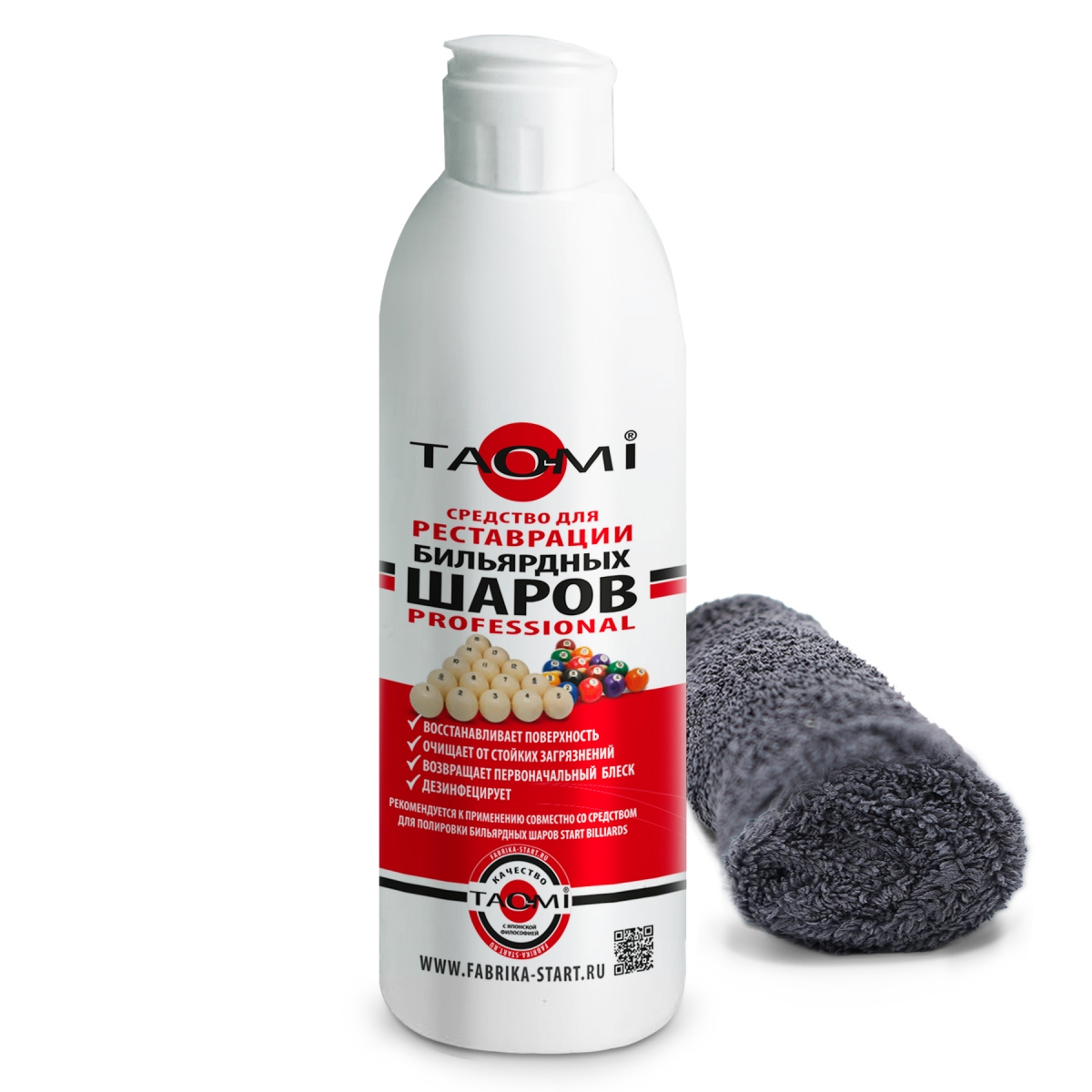 Средство для реставрации бильярдных шаров TAO-MI в комплекте с мягкой махровой салфеткой поставляются в единой упаковке.