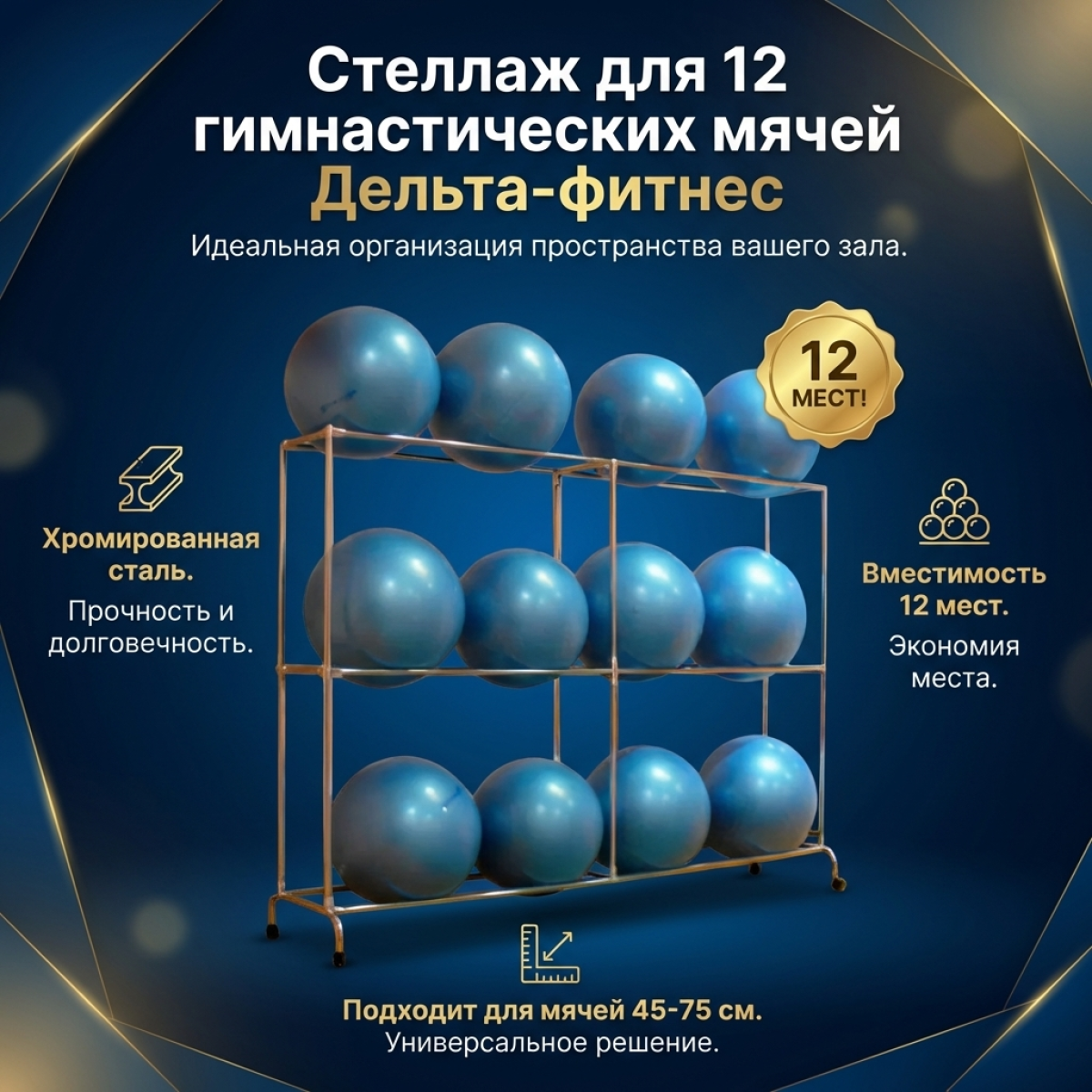 Стеллаж разработан для удобного и компактного хранения до 12 гимнастических мячей (фитболов) в спортивных залах, фитнес-центрах, школах или домашних условиях. Благодаря продуманной конструкции и оптимальным размерам, он идеально подходит для организации пространства и обеспечения порядка.