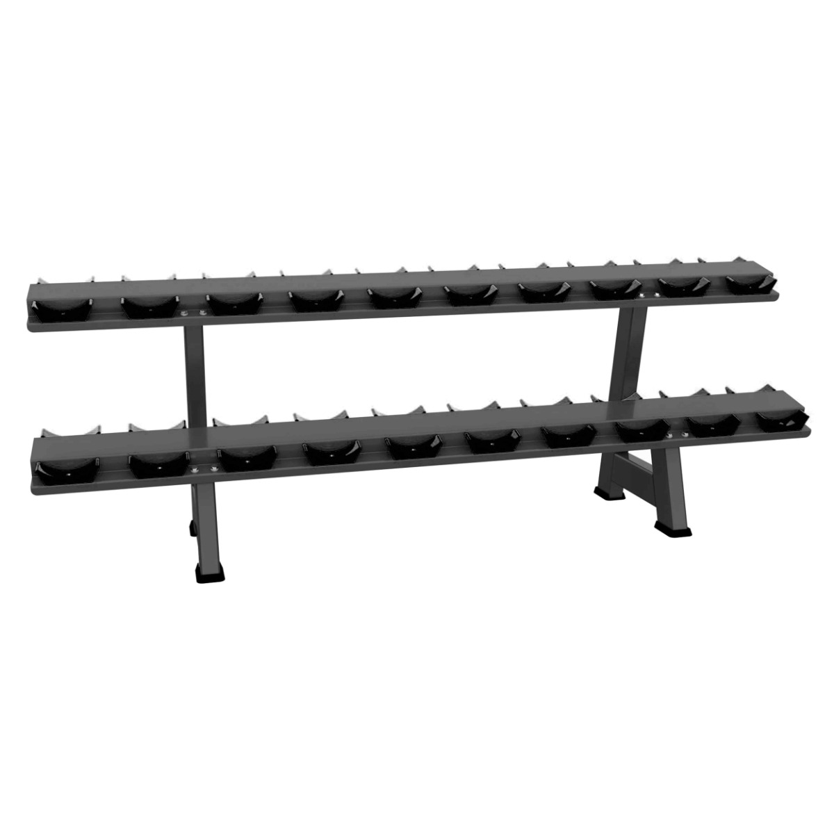 На каждой полке установлены чашеобразные пластиковые ложементы (всего 40 шт.), обеспечивающие надёжную фиксацию гантелей и предотвращающие повреждение поверхности полок.