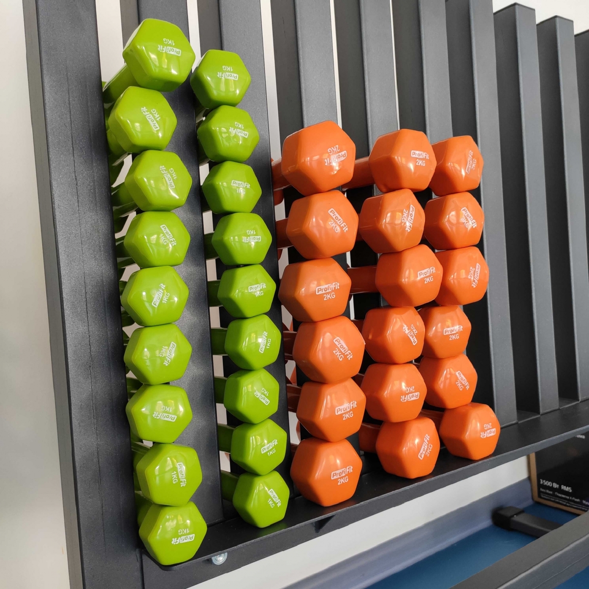 Стойка используется для хранения и удобного использования виниловых гантелей.