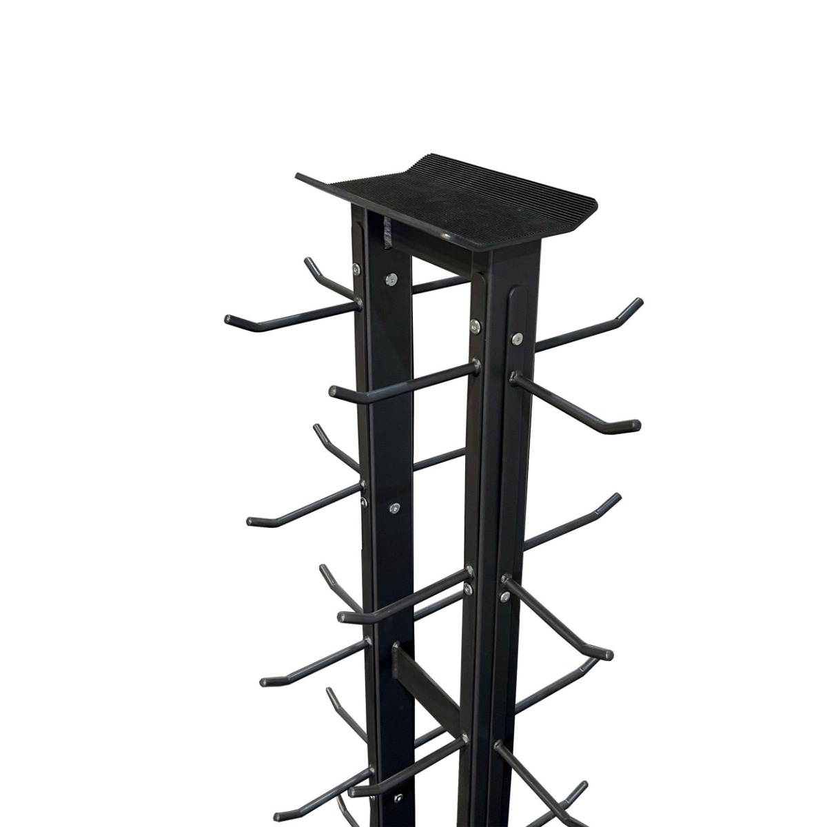 Вертикальная стойка для рукояток и аксессуаров имеет 6 рядов вертикальных держателей-крючков для инвентаря и горизонтальную полку, покрытую резиной, что позволяет ей удерживать большое количество предметов, располагая их на разных уровнях.