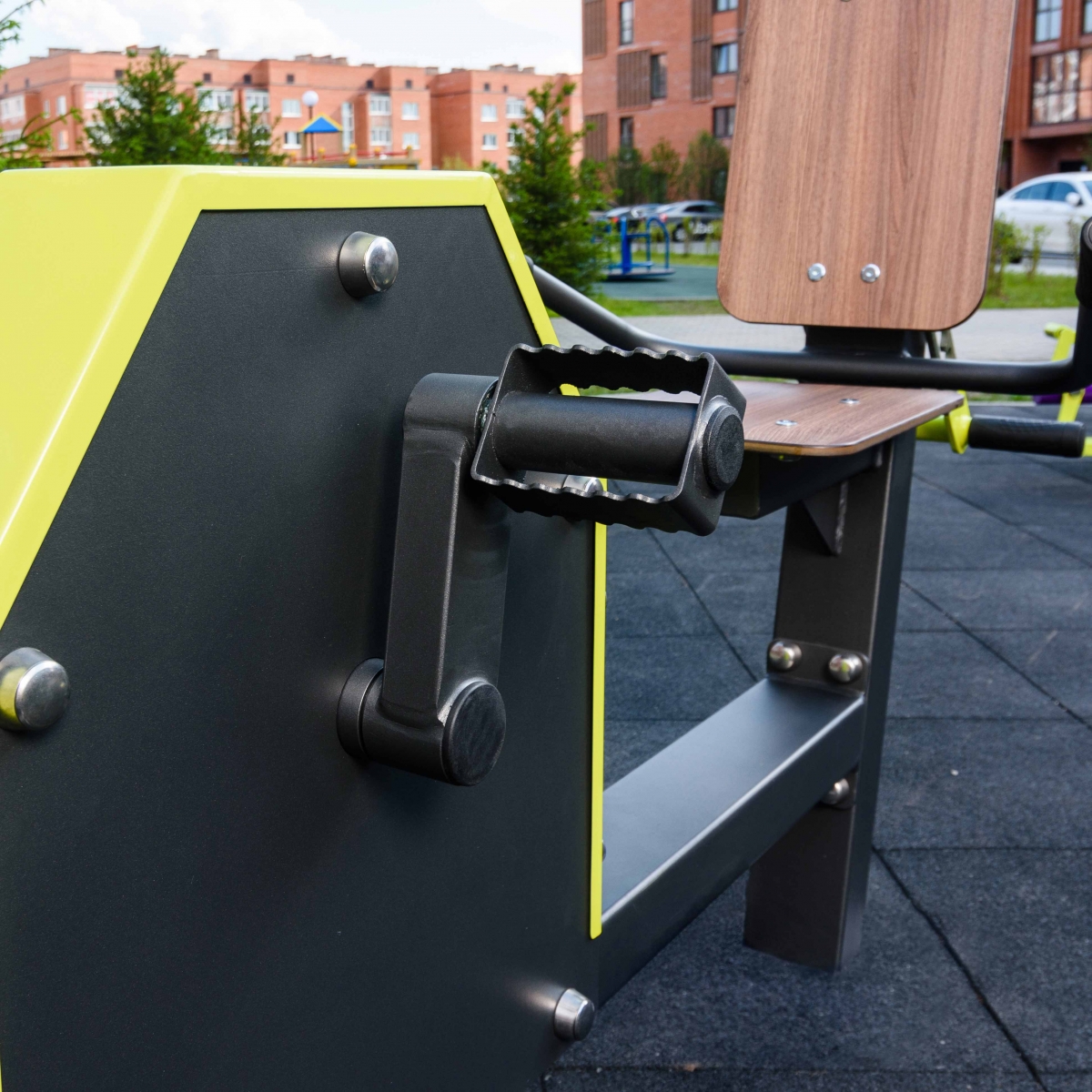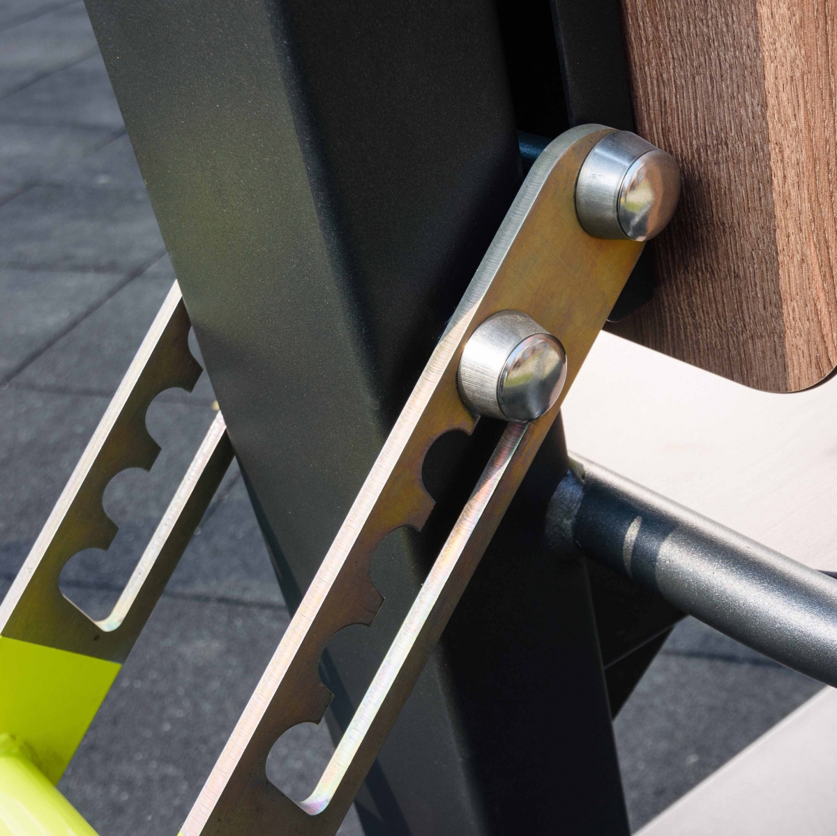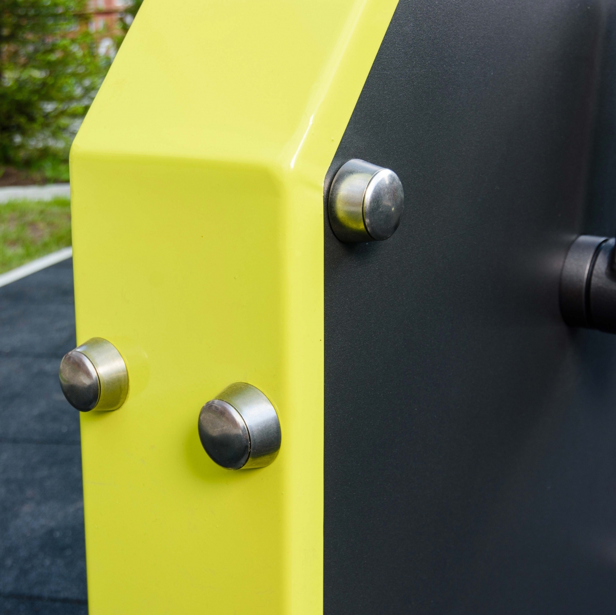 Надёжность и прочность разъёмных соединений конструктивных элементов тренажёра обеспечиваются за счёт использования высококачественного оцинкованного крепежа, выступающие части которого закрыты металлическими защитными колпачками.