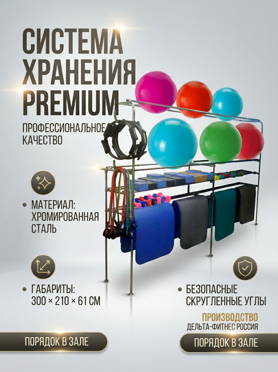 Комбинированная стойка-консоль для размещения 10 гимнастических мячей, 25 пар гантелей,20 штук йога блоков,30 гимнастических ковриков,10 пар отягощений, эспандеров и прочего инвентаря.