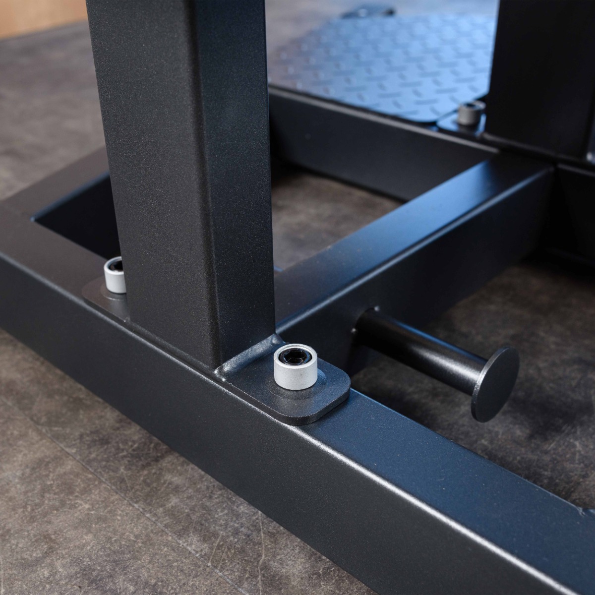 На раме закреплены ребристые металлические пластины – опоры для ног, для устойчивости и защиты спортсмена от скольжения при выполнении упражнения.